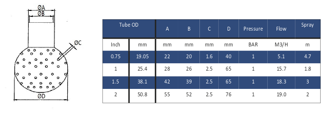 Grade 316 stainless steel, static ball with 360° spray pattern. ¾”, 1”, 1.5” and 2" OD tube inlet.