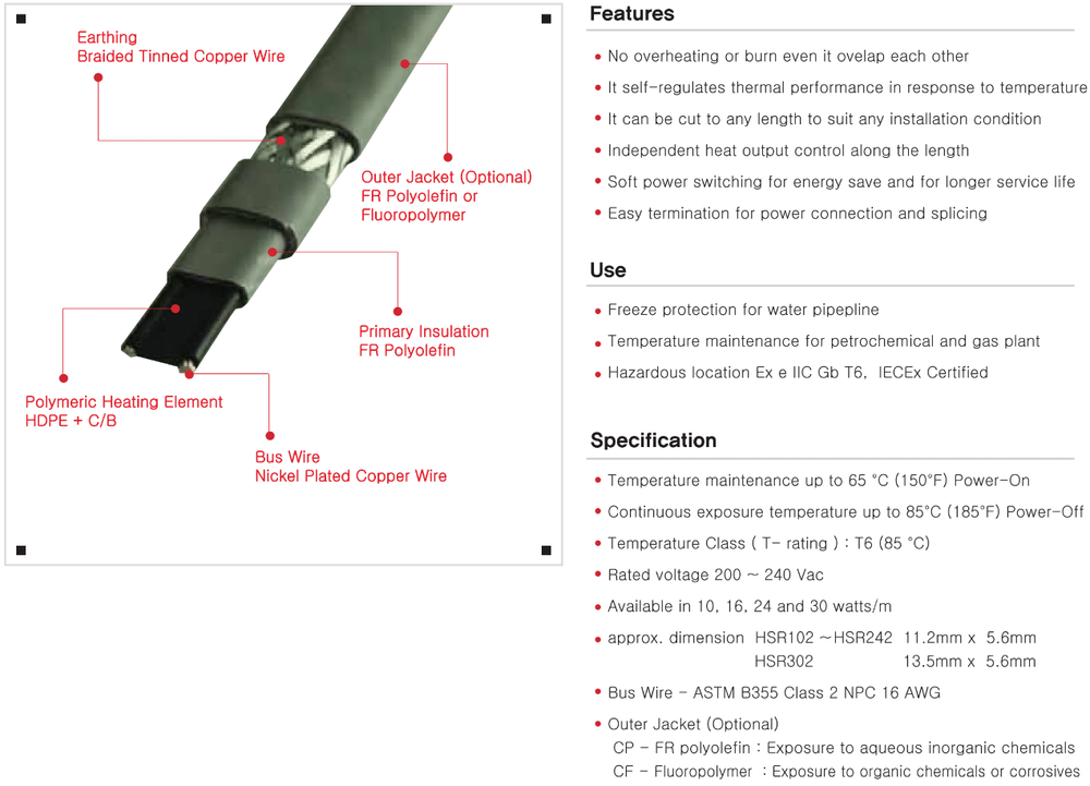 Self regulating trace heating cable for architecture industry, frost protection and temperature maintenance in the industrial sector.