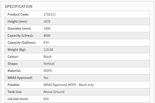 The 1722121 4000 Litre (880 gallons) Industrial Grade Tank is designed to be a heavy duty plastic water tank.  Manufactured with 2 x inlet/outlet locations at the top of the tank and 4 locations at the bottom. We can spply many other sizes of Industrial Grade tanks. Our range also includes rainwater tanks, plastic water tanks, rainwater harvesting systems, cone bottom tanks, horizontal & verticle water tanks and WRAS approved potable water tanks